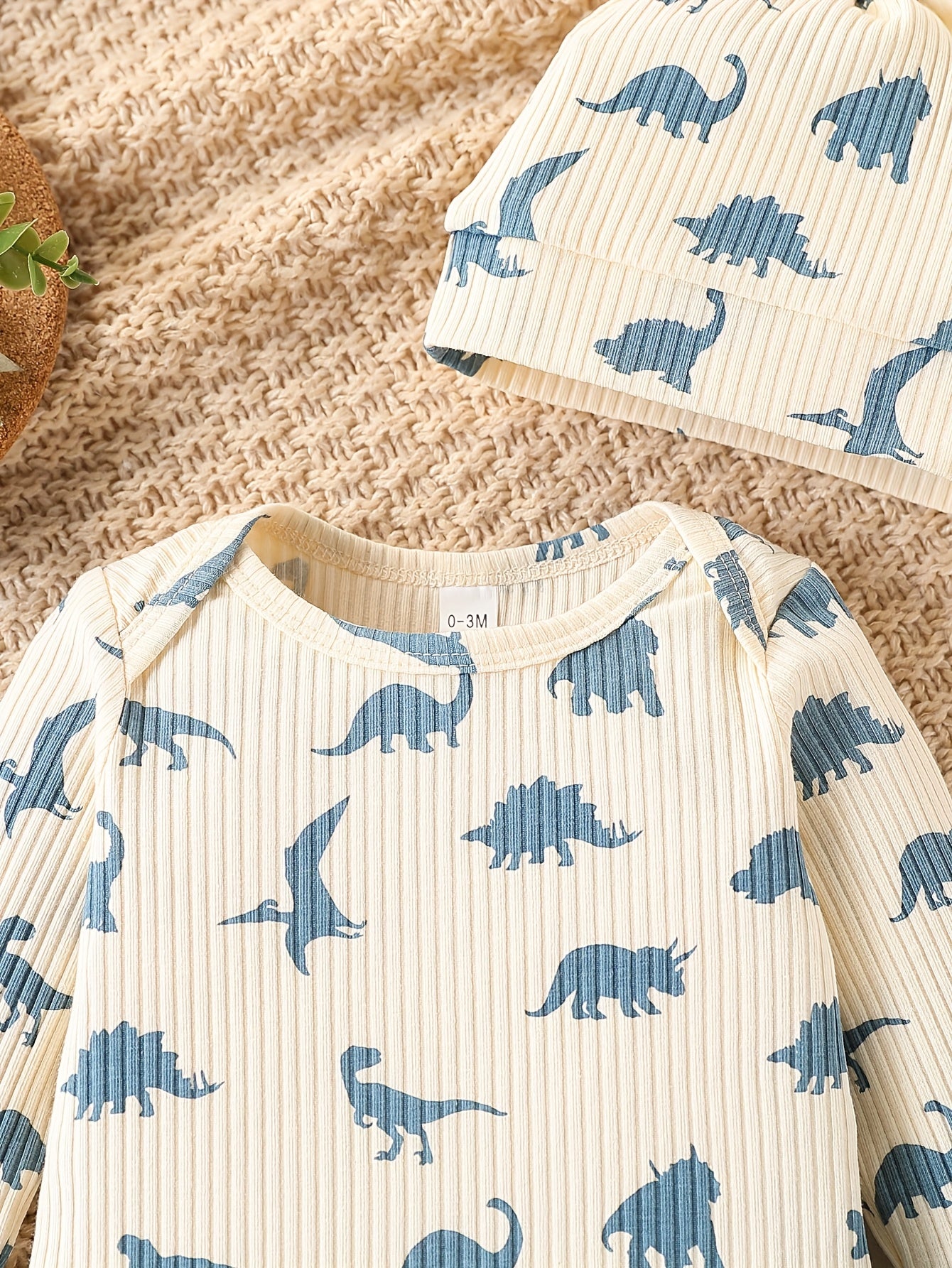 Featuring a long-sleeve romper, cozy pants, and a matching hat, this set is made from soft, slightly stretchy cotton for all-day comfort.